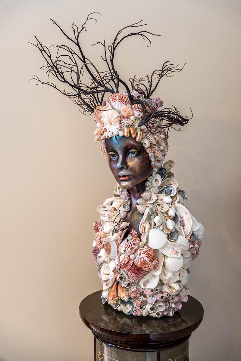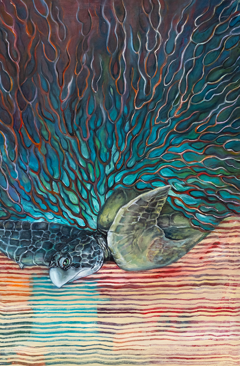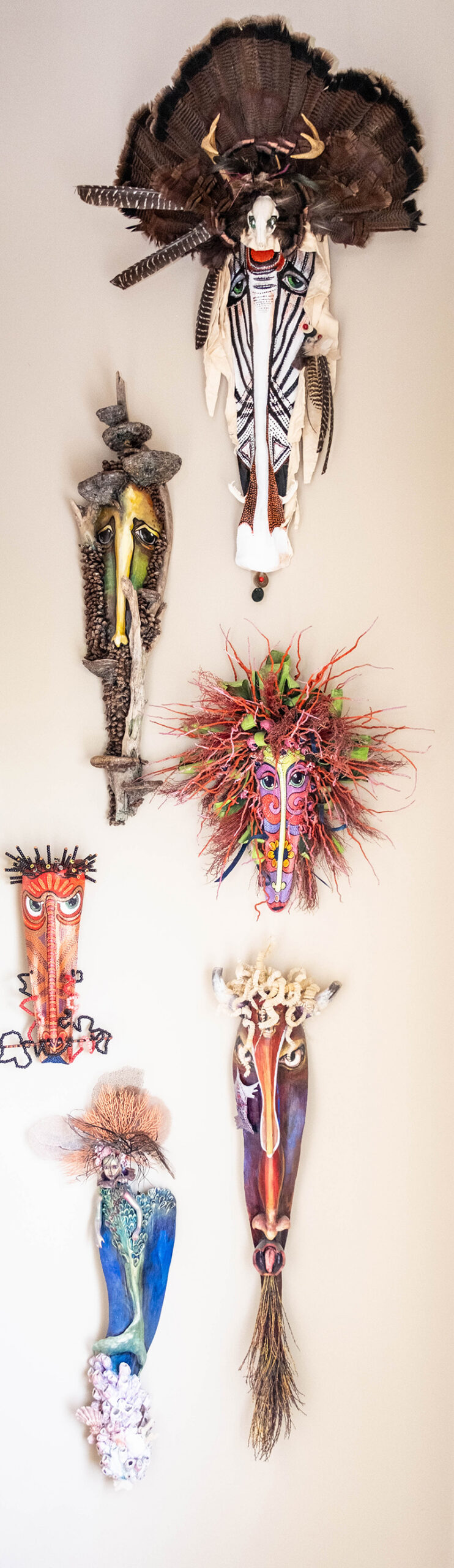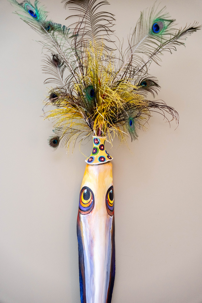 This mixed-media approach reflects the artist’s own free-flowing studio and the large volume of supplies it holds. Acrylics, oils and gouache are just a few of the types of paint splattered across her “mess” of a home studio. And nestled amongst the tubes of paint are an eclectic selection of found objects she and her students have discovered, including gourds, shells and even turkey feathers.