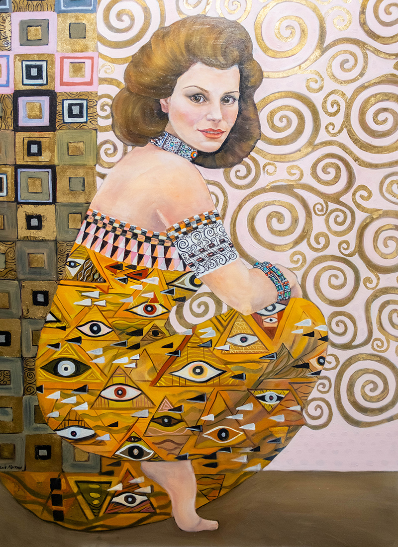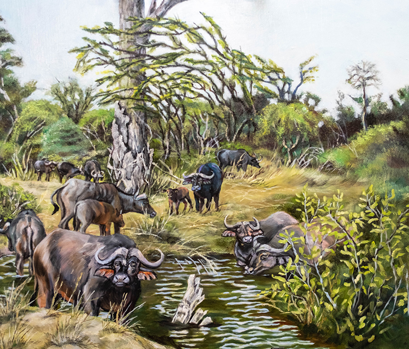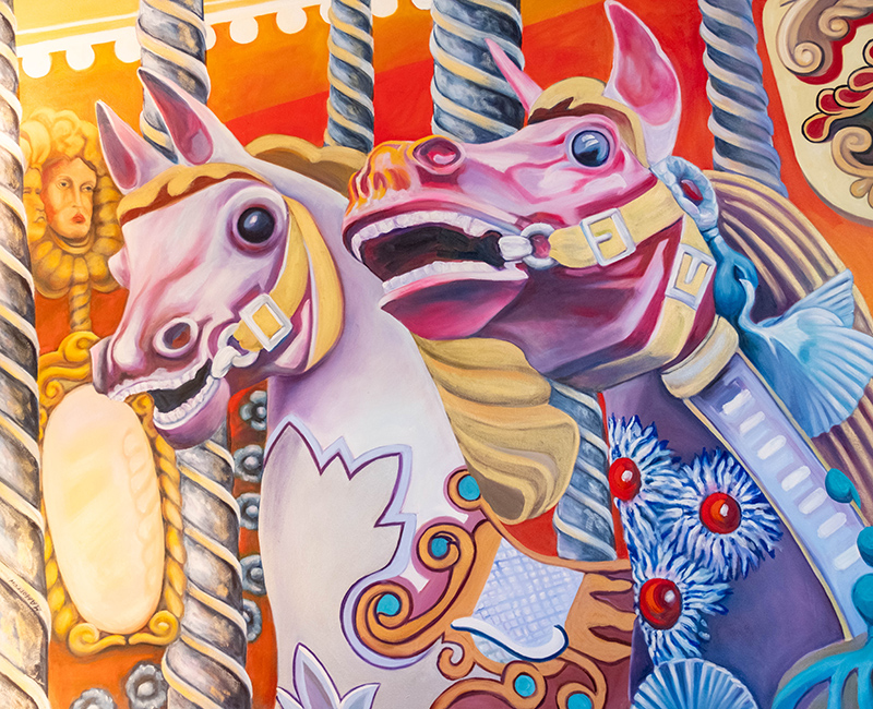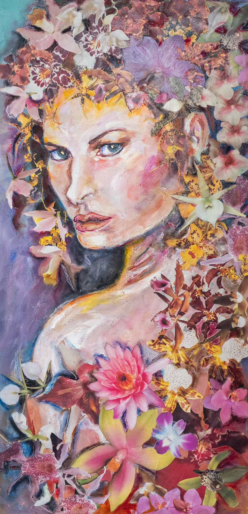 This mixed-media approach reflects the artist’s own free-flowing studio and the large volume of supplies it holds. Acrylics, oils and gouache are just a few of the types of paint splattered across her “mess” of a home studio. And nestled amongst the tubes of paint are an eclectic selection of found objects she and her students have discovered, including gourds, shells and even turkey feathers.