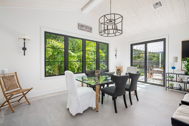 On the opposite side of the house, pocket doors allow for what the owners currently use as a family room to be closed off when you have guests or opened to expand the living area. Like many other rooms in the house, it offers direct access to the outdoors, blurring the line between the interior and the lush exterior.