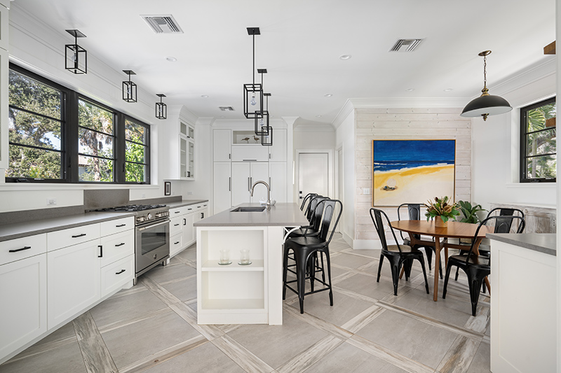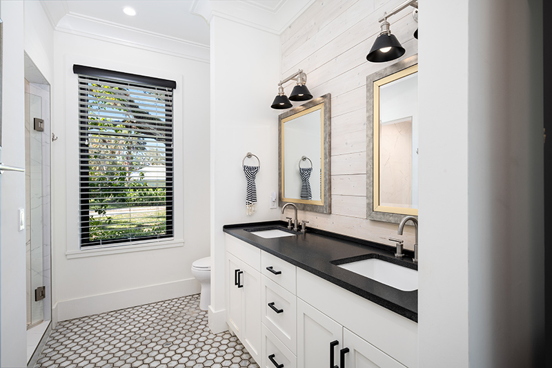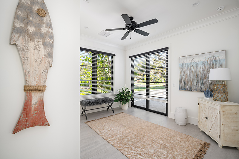 Modern, clean lines are enhanced by shiplap details that soften the aesthetic alongside elevated finishes, including crown molding and feature walls that project the coastal atmosphere.