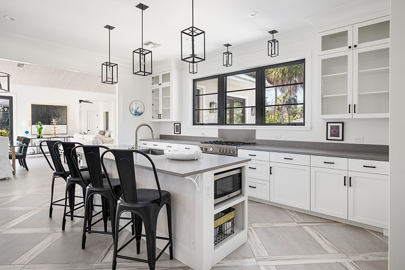 The interior palette is a study in coastal calm – clean lines, achromatic grey-and-white accents that create textural warmth, and black fixtures to anchor the understated elegance alongside Crittall-style windows and doors. The tile flooring mimics the colors of the sand, grounding the modern design in its seaside location, just blocks from the ocean.