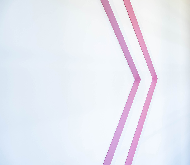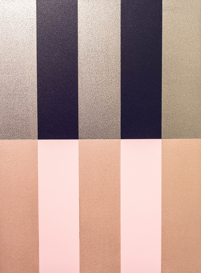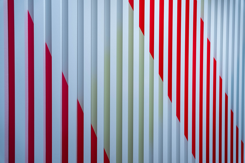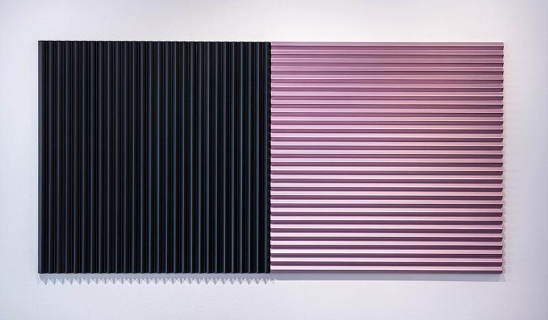 “Then, when I looked a bit closer, I was convinced that the wall color was produced by LED lights emanating from the work. Eventually, making my way closer still, I registered that the painted side portions of the bars were reflecting light onto the wall adjacent to them. Walking from left to right across the work and then back the other direction was a revelation, with the pattern flipping in the process.”