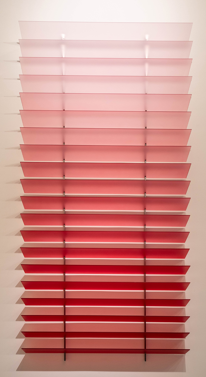 Like immovable kinetic structures, the three red, yellow and gray sculptural works from her Louvre Series explore how materials interact with light, reflection and transparency. Each piece, evocative of ventilation panels or blinds, consists of 20 translucent horizontal slats. The light plays off the mirror finish of the painted glass and aluminum slats, as the intensity of the pigment grows fainter from bottom to top.