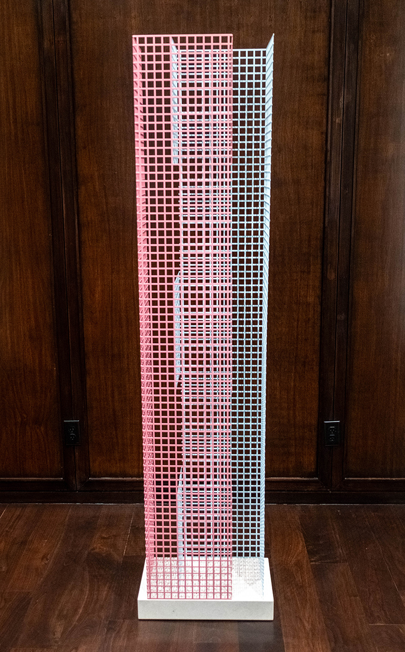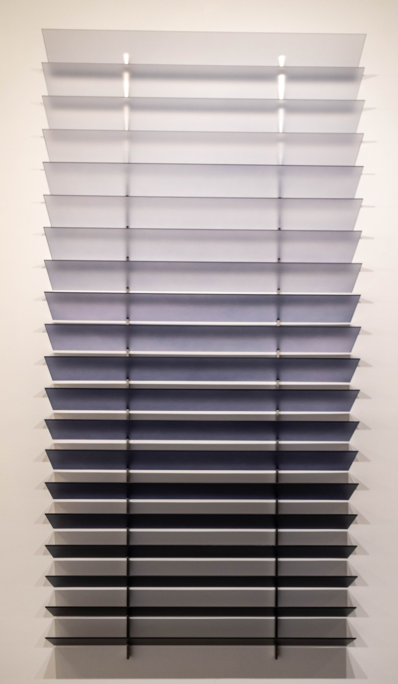 Her Bar Series is particularly intriguing. Constructed of 30 metal bars hanging vertically in a tight row, each bar is some 6 feet high and 2 inches deep. But to fully understand the work, the viewer has to move around the space, as looking from each side produces a separate set of color and patterns.