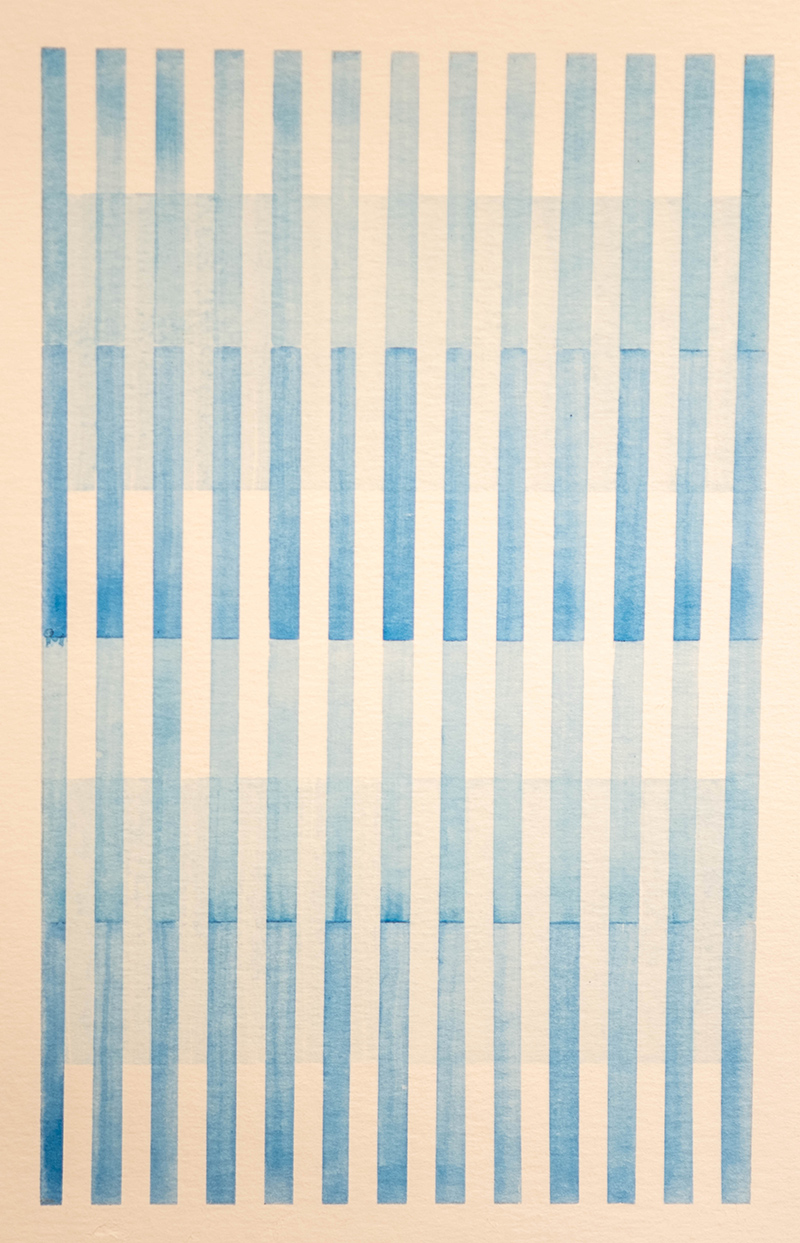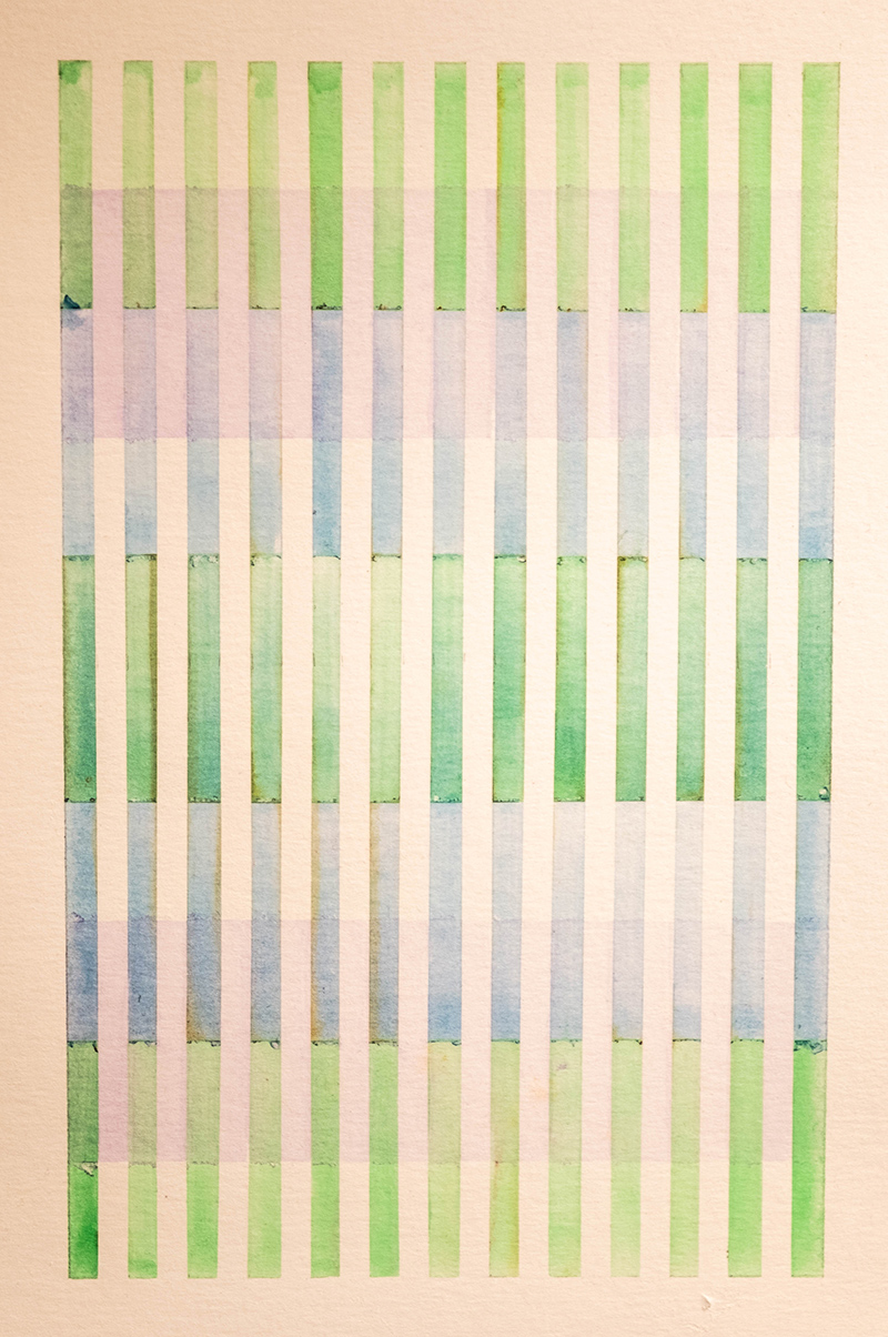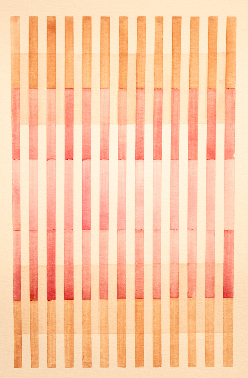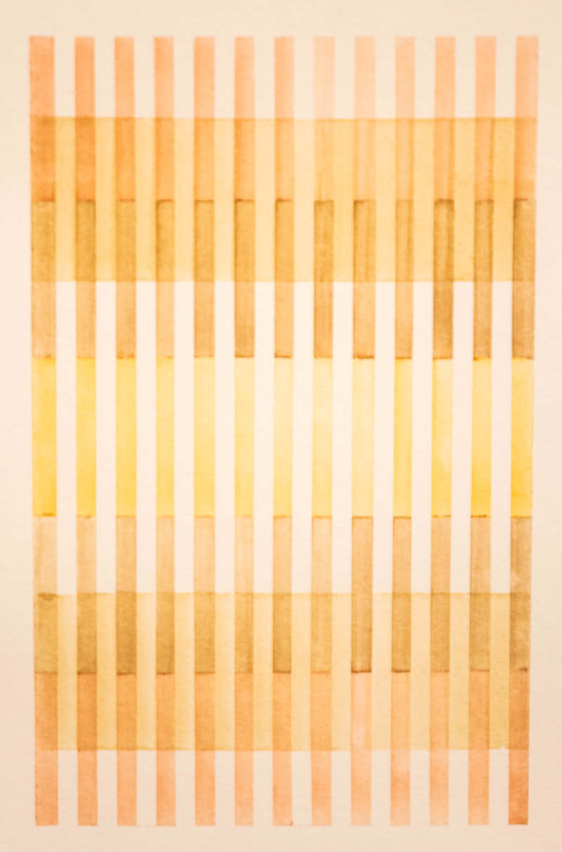 “Begum took up watercolor practice seriously during COVID, a time of isolation, and these works convey the intimacy of that moment. She continues to create in this challenging medium while traveling or as a mindful break in her day amid the occasionally hectic nature of modern life and her busy studio. Grounding her in careful color application and meditative breathing, each brushstroke offers a moment of calm and an opportunity to recognize the geometries of her surrounding environments,” writes Palmer.