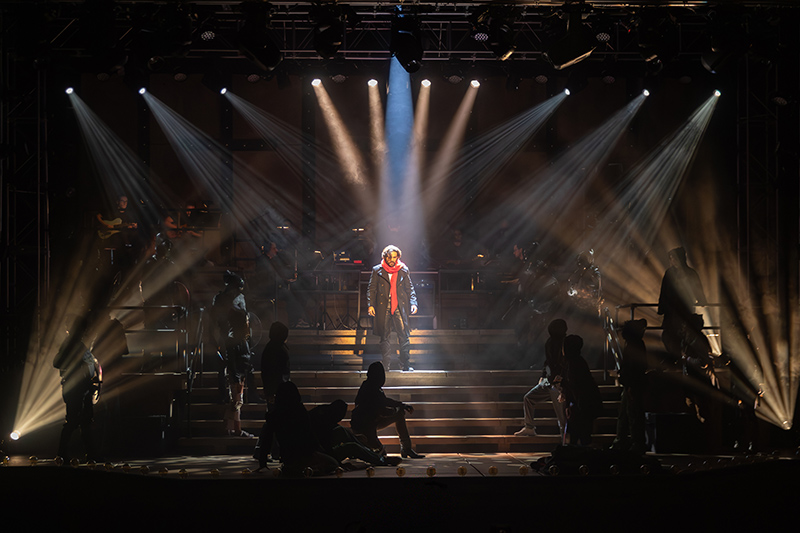 Yael Lubetzky’s fantastic lighting evokes a rock concert, frequently isolating characters in shafts from above, dramatically and appropriately.