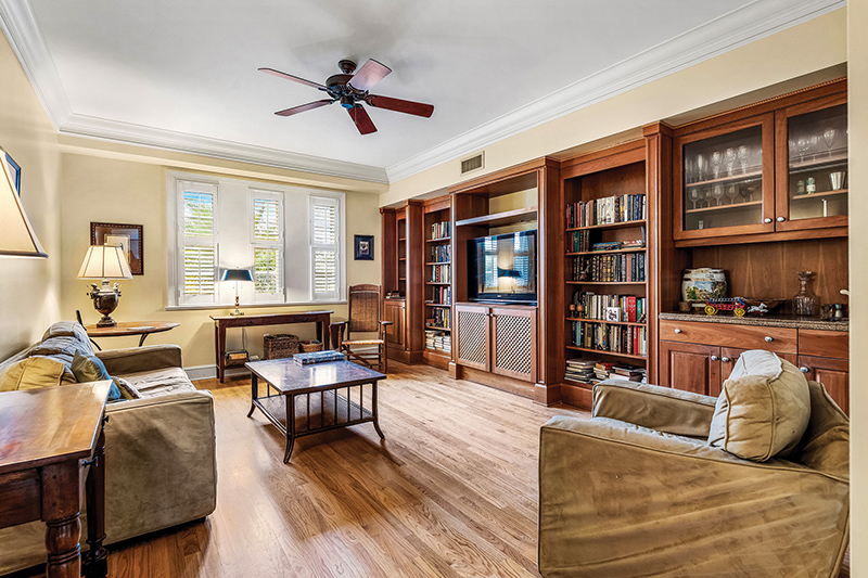 Immediately ahead, French doors open into the den, which has a relaxing, comfy vibe, featuring plantation shutters, ceiling fan and wood plank-look tile flooring. The star here is a gorgeous, honey-hued, solid-wood, wall-to-wall custom built-in, with shelving and glass-front cabinetry for books and display items and a central space for TV hook-up.