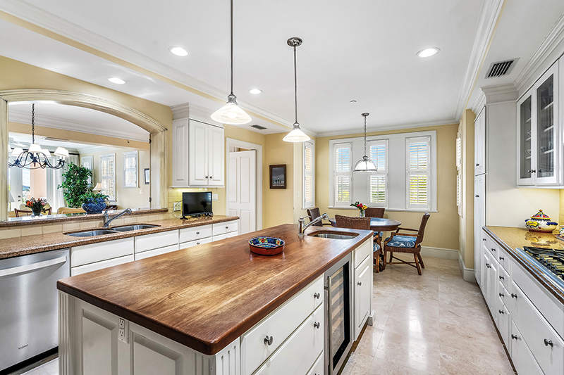 Left off the foyer, are the light-filled central living spaces, embracing kitchen, dining room and grand parlor/living room, where three sets of glass French doors reveal the full-length, covered balcony with a certifiable “million-dollar view” that takes in a sweep of wide lagoon, sky, boats, dolphin, seabirds and Vero’s famous barrier island across the water.