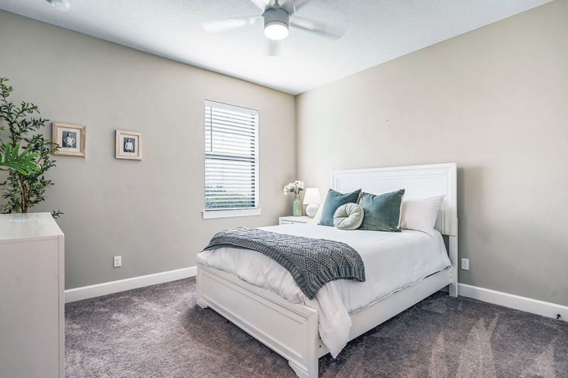 Both guest bedrooms are carpeted, and each has a closet, ceiling fan/light, and pleasant neighborhood view. They share a full bathroom, in the same soft colors as the primary, with a single basin, sand-colored quartz-top vanity, loo, and tub/shower.