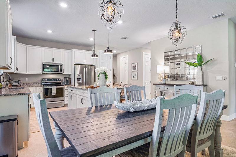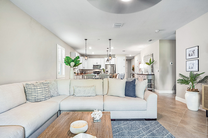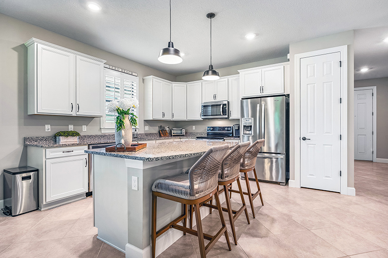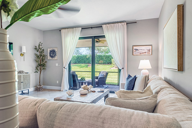 Along the home’s west side, the kitchen/dining room/living room space stretches to wide glass sliders that open onto the screened lanai and let in a peaceful view of green backyard and preserve buffer.