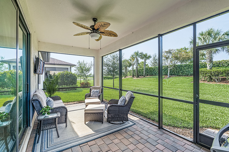 The versatile lanai includes a leaf-blade ceiling fan/light. With ample space for seating, dining and a grill, the outdoor room expands the home’s entertaining space when opened to the living room.