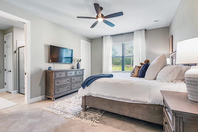 In pale and restful earth hues, the primary suite is a peaceful haven with a view of the preserve. A ceiling fan/light stirs the air, and a walk-in closet provides a wealth of storage space.