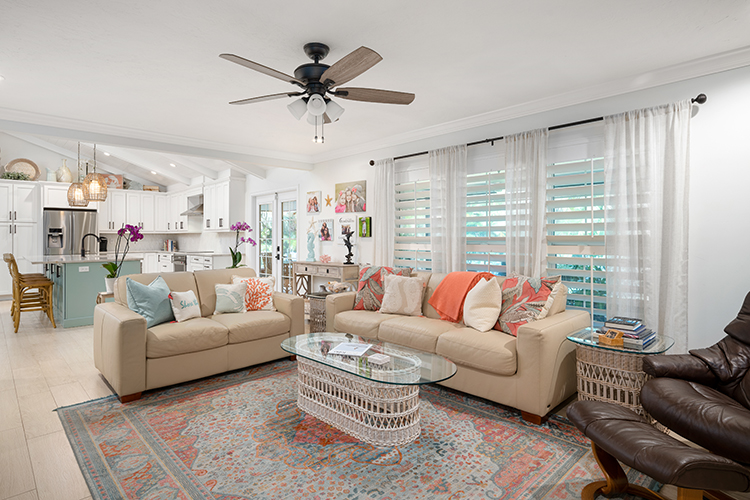 What really sold Brenda on the couple’s charming island bungalow was the vaulted ceiling, recalls Lloyd. He and his wife recently updated the home with the assistance of Coastal Interiors, opening up rooms and creating a spacious floorplan.