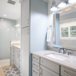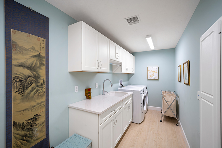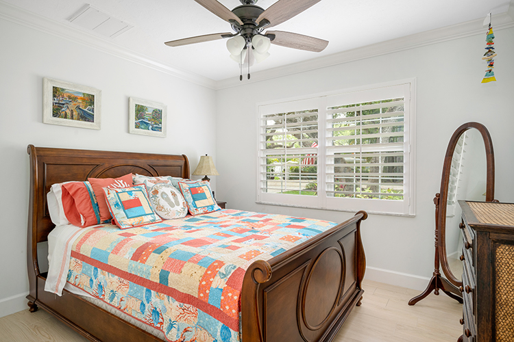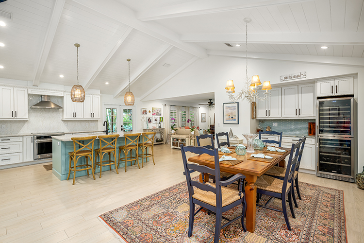 Skylights and a tongue and groove vaulted ceiling with beams makes for a bright interior. Crown molding, custom cabinets, plantation shutters and mother of pearl inlay are just a few of the fine details that add hints of elegance to the home’s beachy vibe.