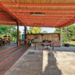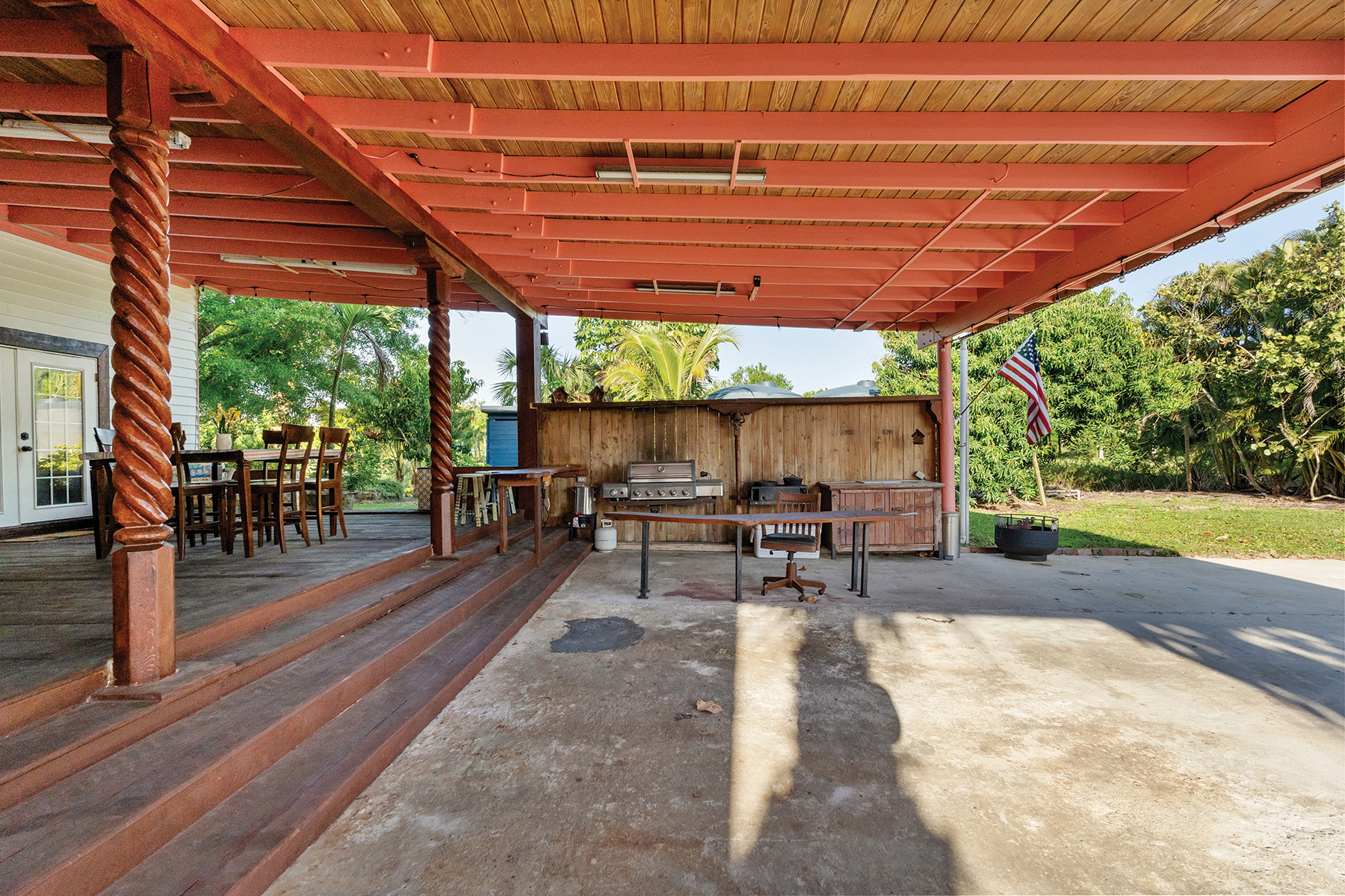 French doors from the living room and dining room open onto the back porch, a huge space for friends and family to share meals and fellowship, sporting an open-beam ceiling and the same spiraled columns as the front porch. Here you’ll also find a summer kitchen, built-in BBQ, sink, ceiling fan, long sideboard and plenty of lighting for all sorts of entertaining.