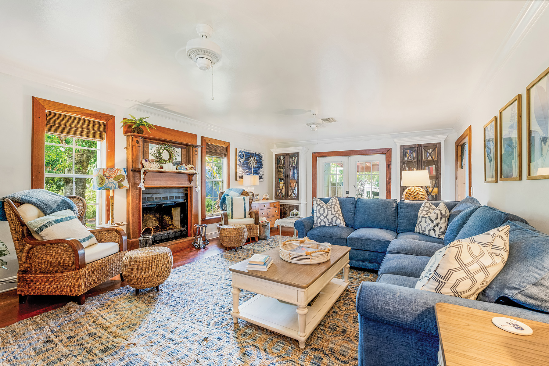 At the end of a palm edged road, tucked within a canopy of trees, the home exudes welcome. A huge open-beam porch spans the entire front facade, its dark, elegant, 6-inch spiraled columns crafted of semi-green Douglas Fir from New Mexico’s Sangre De Cristo mountains. The spacious, two-level porch deck is of honey-hued rough-cut pine from a sawmill in the Ocala National Forest.
