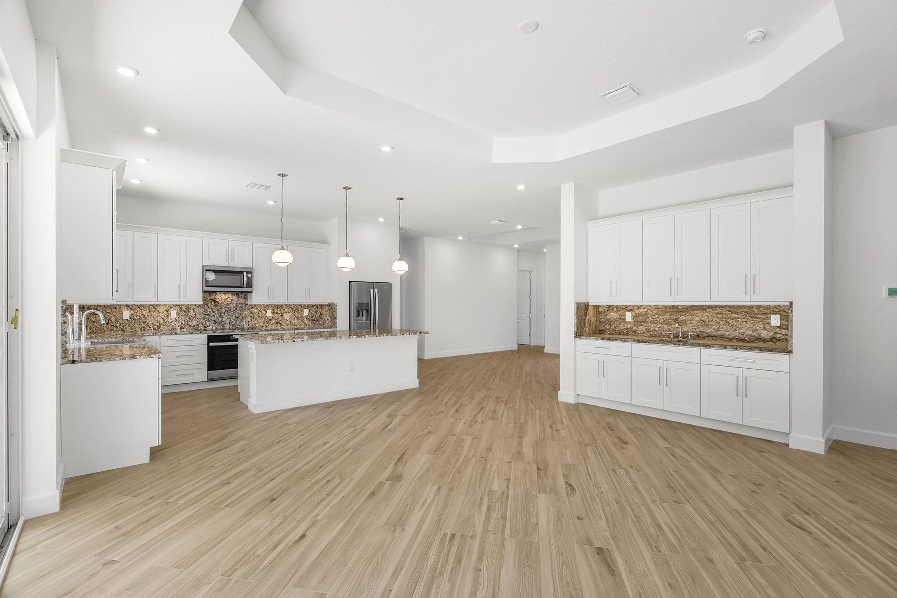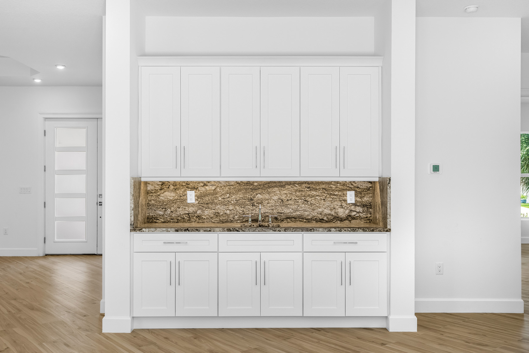Facing the great room and flanked by handsome inset columns, is a long, sleek wet bar with cabinets above and below, a square, sunken stainless-steel sink, and a Smokey Mountain granite countertop.