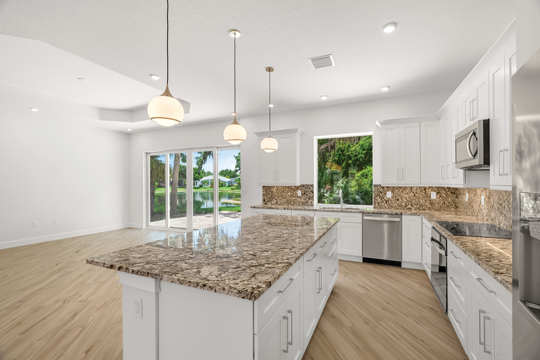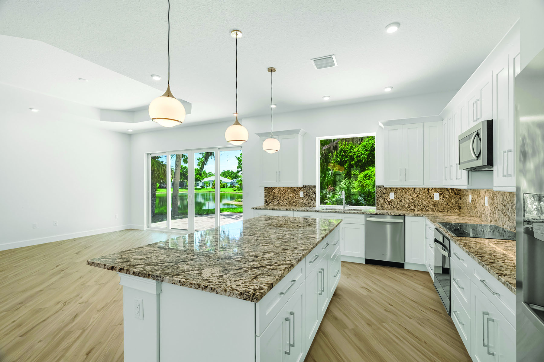 Additional features: Gated community; epoxied 2-car garage; central heat/air; impact windows/doors throughout; recessed lighting throughout; gourmet island kitchen; 9-foot tray ceilings throughout; glass sliders; 8-foot doors; Blue Smokey Mountain granite countertops in kitchen and bathrooms; wet bar; pantry; 3 walk-in closets; laundry room w/hook-ups for washer and dryer; Mirage Italian porcelain tile flooring throughout; surrounded by woodsy preserve areas; big back patio; room for a pool; 2 attic storage areas w/pull-down stairs; county water and sewer