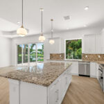 The ‘Wow Factor’ of the open kitchen is a 10, with a wealth of gleaming white base and crown molding-topped wall cabinetry and glowing stretches of absolutely gorgeous cream/black/blue granite countertops and full-length splash. You’ll also find plenty of electric outlets along the counters and the island – which offers wide workspace, lots of storage and a snack bar.