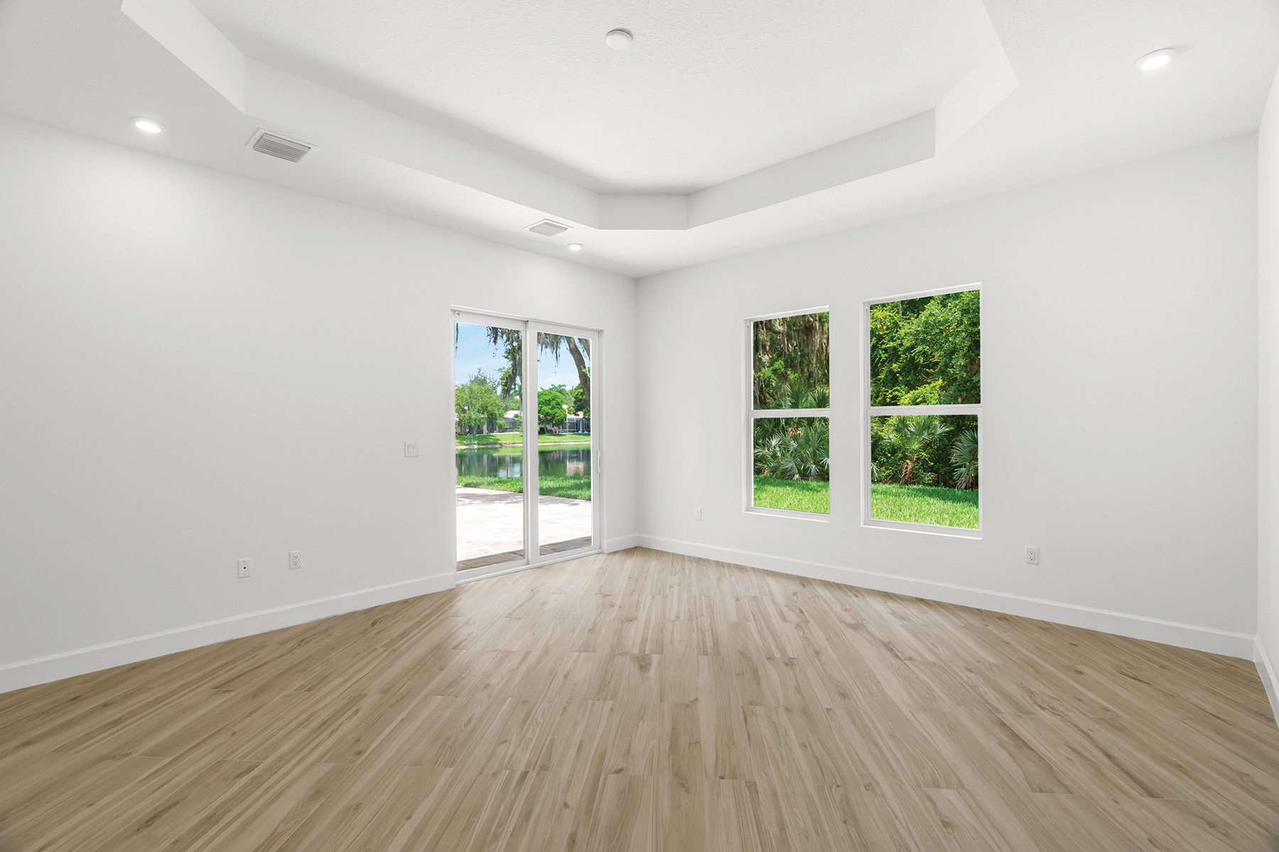 Along the home’s east side is the primary suite, a cool and spacious retreat with tray ceiling, sliders to the patio, and, along the hall to the primary bathroom, two walk-in closets – one large, the other larger.