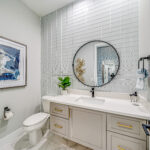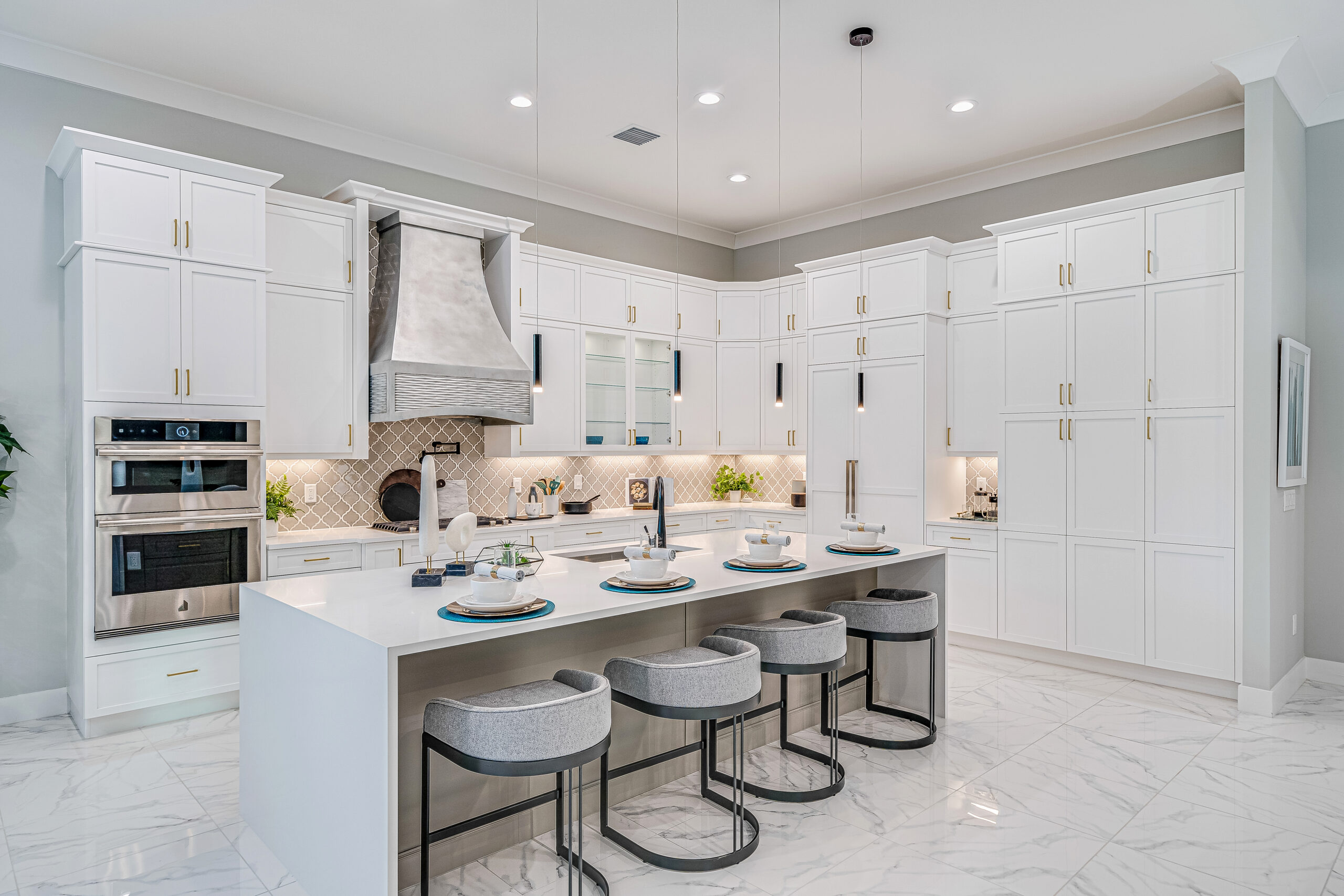 The gourmet kitchen is a chef’s dream, centered around an oversized island with ample seating and boasting a deep, stainless-steel sink, a pot filler, premium appliances, including a natural-gas cooktop, with a composite hood as a dramatic focal point. Nearby, a beverage refrigerator and a powder room are conveniently positioned for guests’ needs.