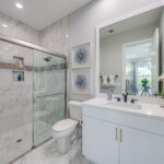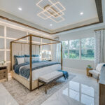 The elegant, spa-like bathroom is appointed with a freestanding soaking tub, a walk-in shower, water closet, dual sinks with modern LED-lit mirrors and transom windows that fill the space with natural light while maintaining privacy. Completing the suite is a vast walk-in closet with custom built-ins, a vanity, and ample space to create an inviting dressing room.