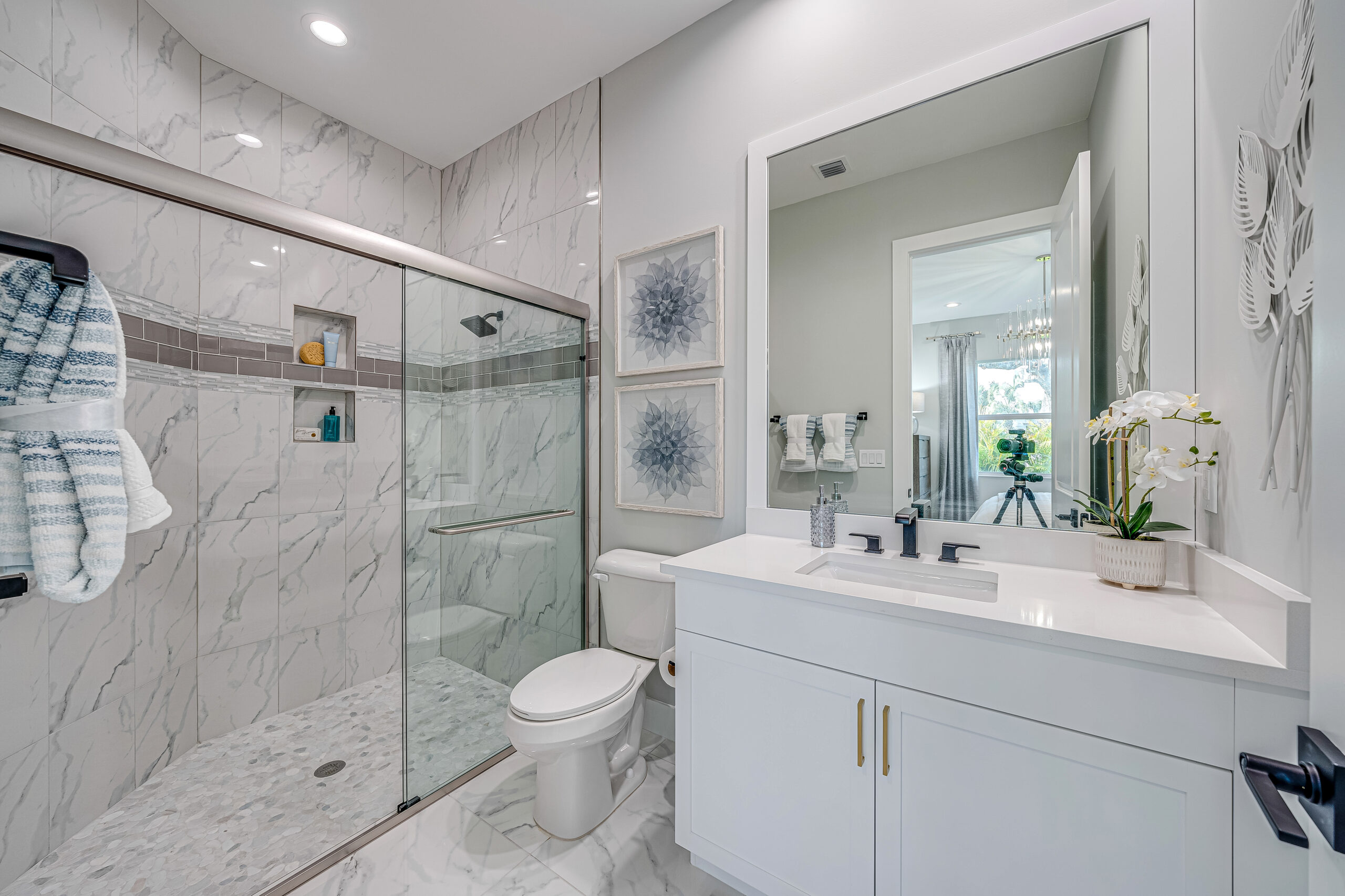 Located in a private wing at the front of the house, two spacious guest suites feature ensuite bathrooms, offering privacy and comfort for visitors. This placement near the garage hallway allows guests to come and go without disturbing the primary suite at the rear.