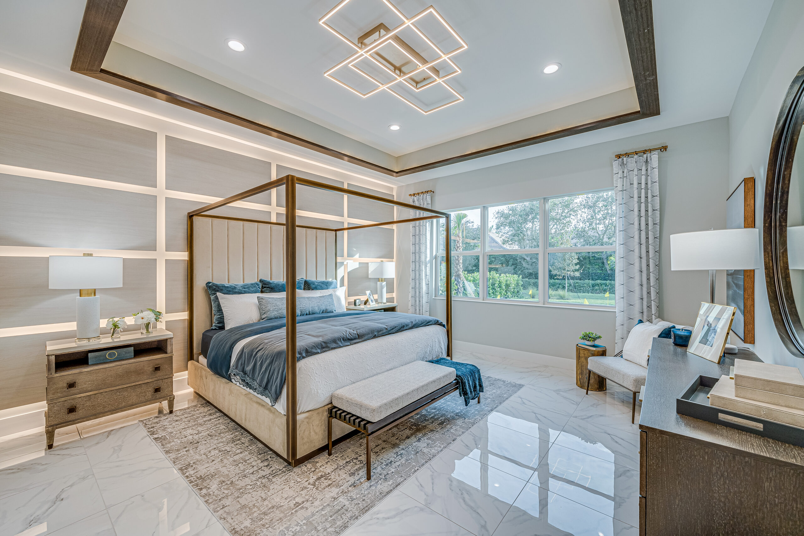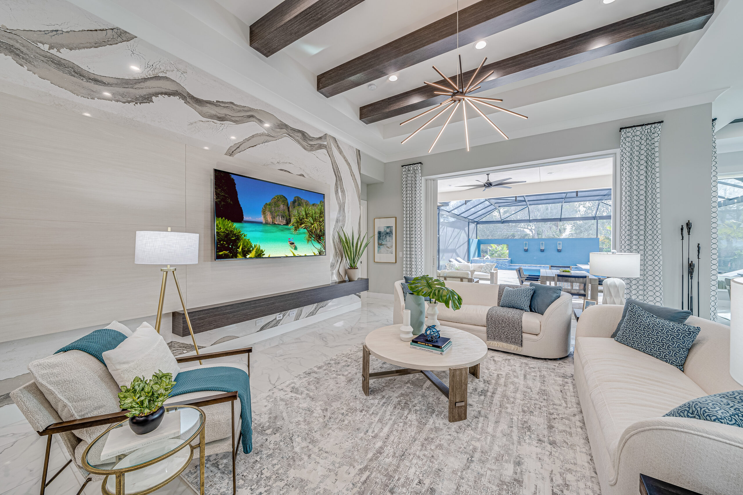 The social space is defined by a quartz TV wall and its connection to the outdoors. Expansive glass doors allow the interior to merge with the pool patio, while large windows and transoms flood the area with abundant natural light.