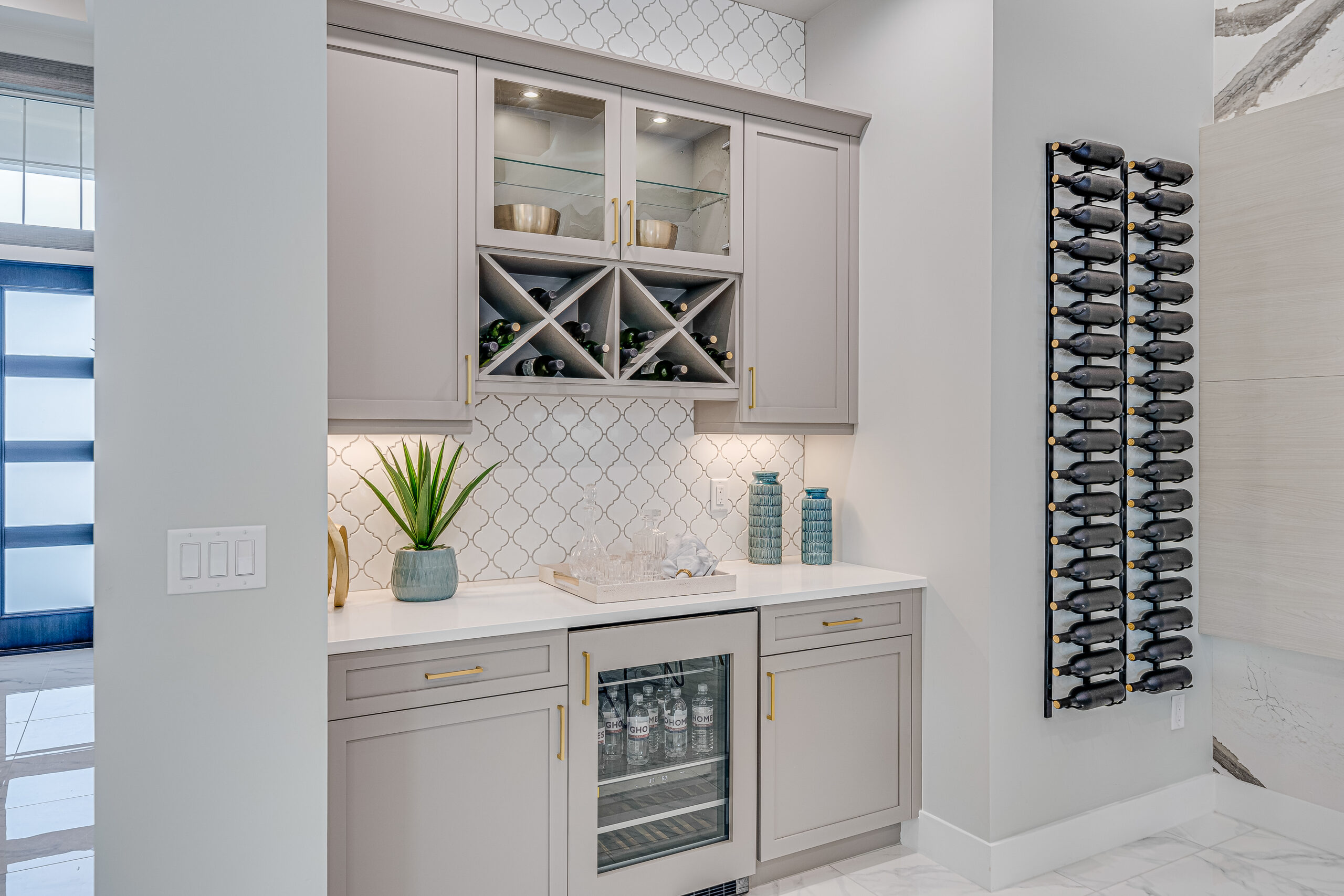 To the right of the foyer, a versatile space currently staged as a music room and office demonstrates the home’s flexibility. Framed by elegant glass barn doors, the room features built-in floating cabinets and a clever closet conversion with a glass-doored guitar display. With its existing closet, this room can also serve as a fourth bedroom.