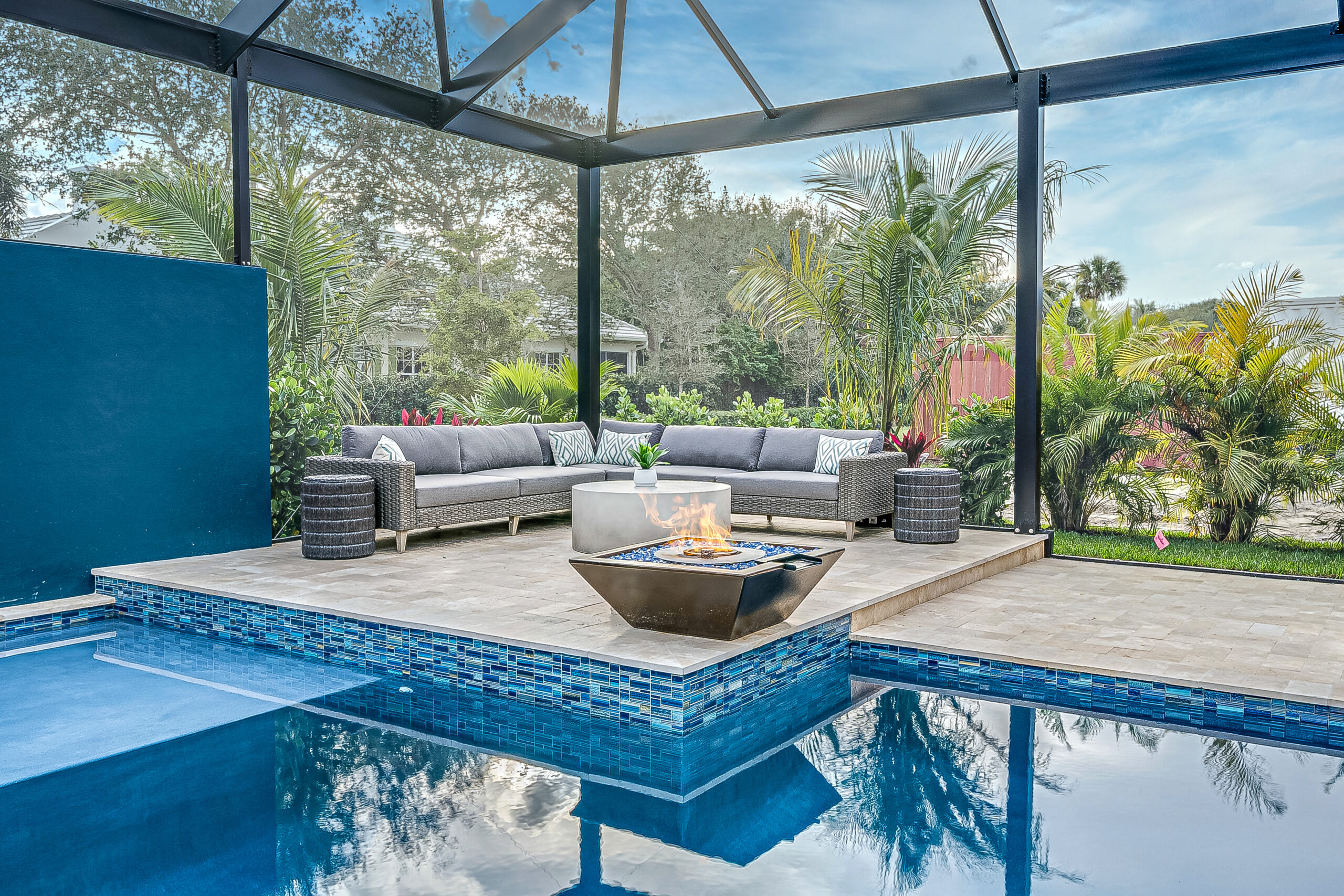 A deep, blue wall across the backside of the pool creates a stunning backdrop for the gas lanterns that flicker to life in the evening, casting an enchanting glow once the sun has gone down.