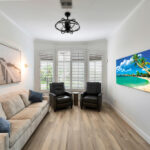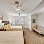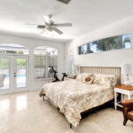 Accessed from the foyer, the home’s north “wing” is occupied solely by the primary suite, a roomy oasis of peace and quiet, with creamy porcelain tiled floors, enough space for a couple comfy chairs, a long, arched transom window high above the headboard, and a large, plantation-shuttered window on either side. Glass French doors with transoms and a wide window occupy the east/lanai side of the suite, so you can walk right out and jump into your beautiful pool for a bracing start to the day.