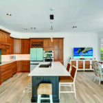 The upgraded kitchen comes with honey-hued, shelf-top cabinetry, including a lattice wine rack; a deep, single-basin black sink with black faucet; gleaming quartz countertop and glass tile backsplash behind the smooth cooktop; a quartz-top island that encompasses sink and lunch counter; and a chandelier above the kitchen table, which sits within a multi-window bay. An 11-foot impact slider wall opens to the lanai.