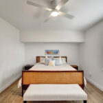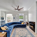 Ahead from the foyer is the central, open living room/dining room space, cooled by a gorgeous, wood-look, nine-blade fan that creates a dramatic contrast with the beautiful white-on-white interior architecture.