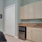 To the right as you enter the courtyard is the cozy, convenient casita/cabana, a quiet retreat and the perfect place for guests, back-from-college kiddo, or fill-in-the-blank. Here, you will find a bedroom with closet, granite-top floor-and-wall storage unit with sink, mini fridge and power outlets. There is also a full bath with shower and access to the courtyard.