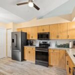 The kitchen itself glows with pale gold-hued cabinetry, accented with simple black rod pulls and cream/black mottled granite countertops. A deep, black composite sink, black range and black, water-in-door fridge add style, complimented by a built-in microwave, dishwasher, and full-length white tile splash, all beneath a soaring cathedral ceiling with sleek, three-blade fan/light. The kitchen also offers access to the garage.