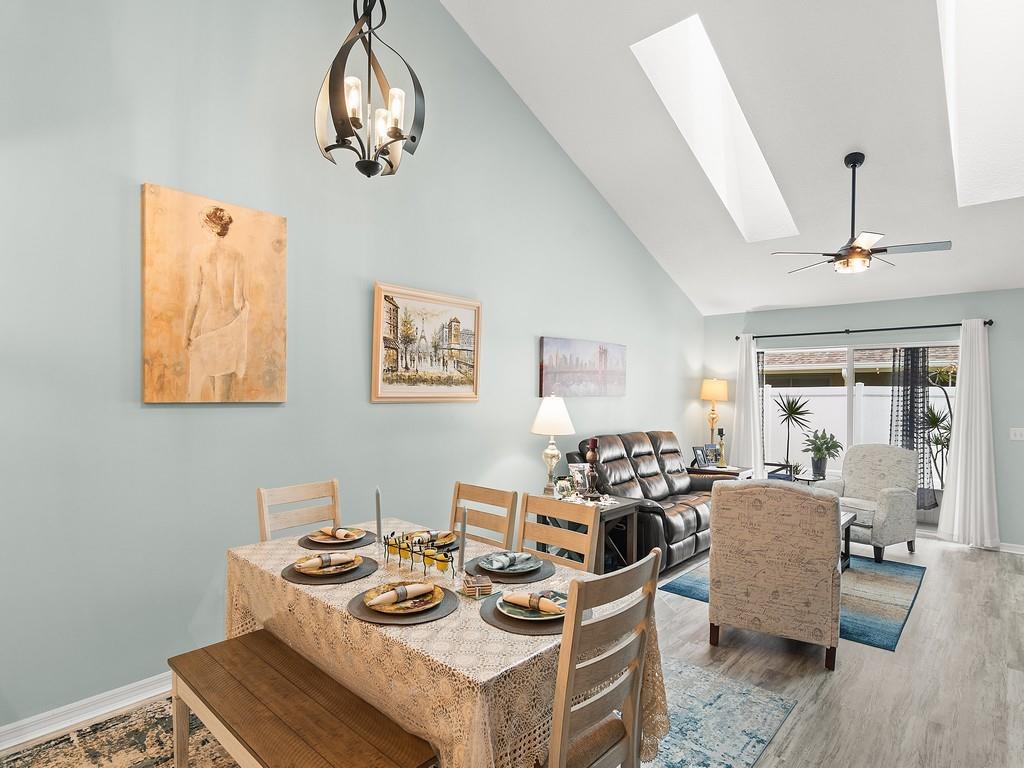 Additional features: Gated entrance; attached, 1-space garage; central heat/air (new a/c 2022); spacious kitchen; open floor plan; recessed lighting; skylights; glass sliders; laundry closet; volume ceilings; 4 ceiling fans; long screened porch/patio; fence; gutters; county sewer; public water; community pool and clubhouse; $300 monthly HOA fee covers common areas, lawn care/irrigation, reserve fund, roof maintenance and security; lease OK w/restrictions; furniture negotiable