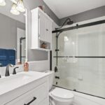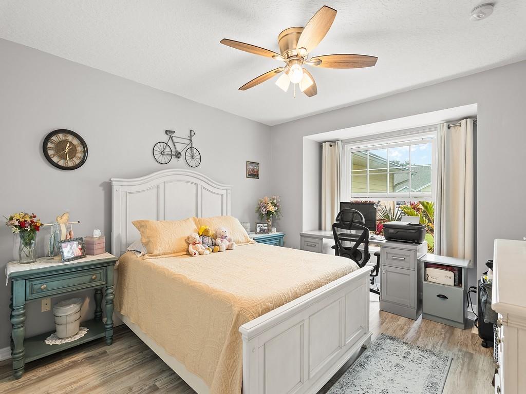 The second ensuite bedroom soothes in whisper gray and offers a double bi-fold closet; ceiling fan/light; and a wide alcove with a large, mullioned window that currently is set up as small, efficient office space. The full bath is done in the same sleek black and white style as the primary, but with a tub/shower.