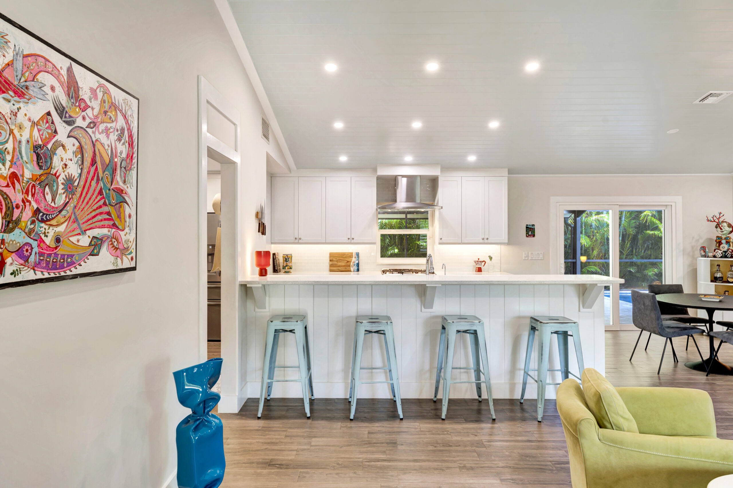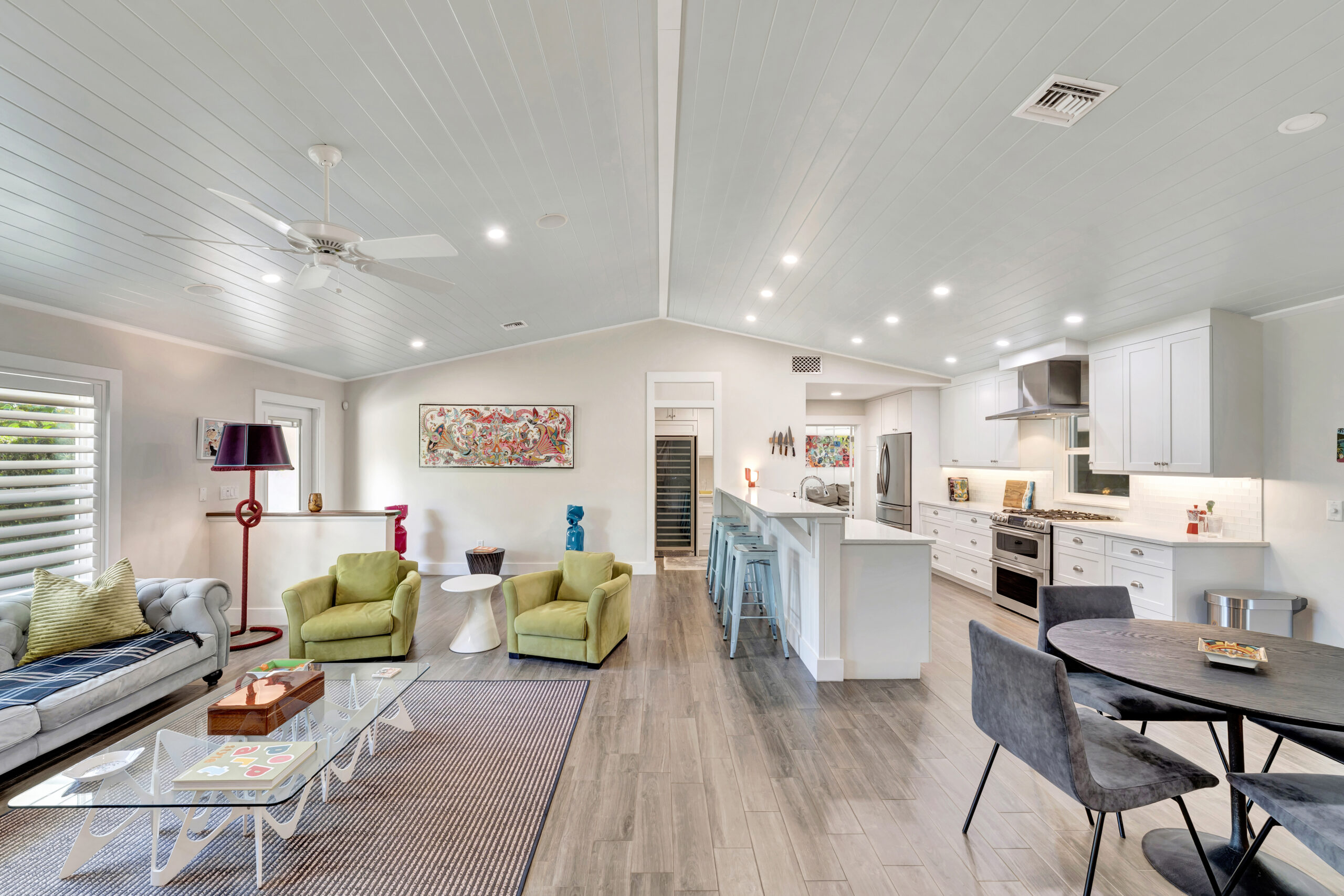 The renovated home features elevated finishes, including crown molding, a shiplap cathedral ceiling and plantation shutters that allow for control of the abundant Florida sunshine.