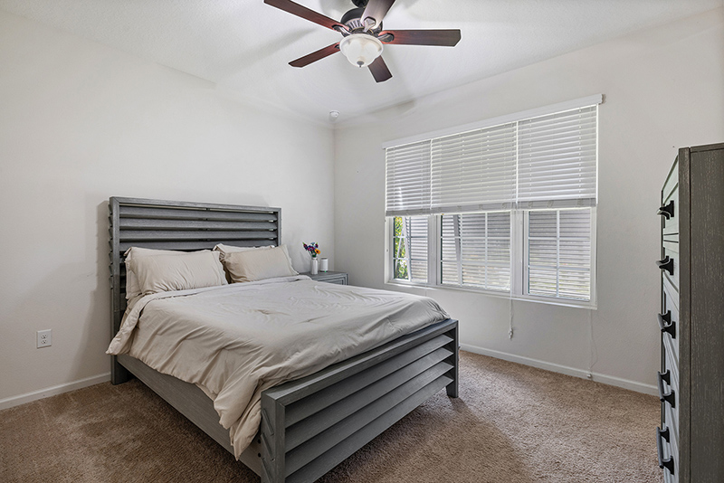 The ensuite guest baths both offer comfy carpeting, closets, ceiling fan/lights and wide windows with pleasant neighborhood views. Both have tub/showers and single-basin vanities with the same white cabinetry and granite countertops as the kitchen.