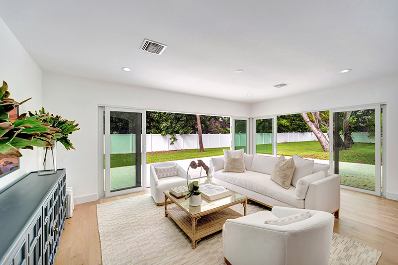 At the back of the house, the living room opens to the outdoors through walls of sliding glass doors on two intersecting sides, maximizing the indoor-outdoor Florida lifestyle.
