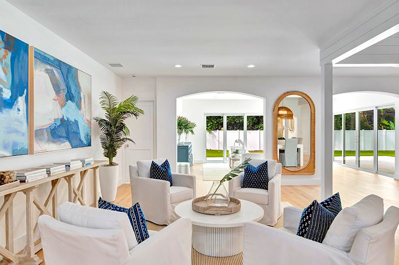 The structure was taken down to the studs for a comprehensive renovation that included new plumbing, electrical, air conditioning, impact windows and a standing-seam metal roof.