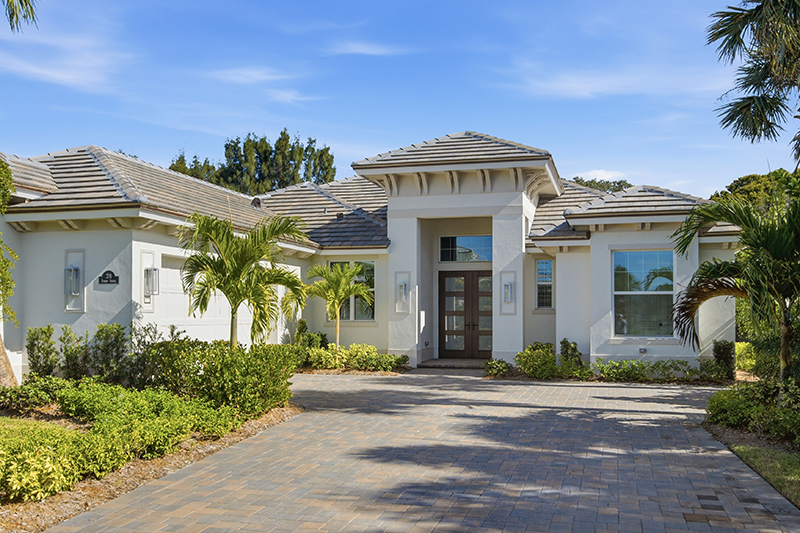 The paver driveway leads up to a covered entry that invites guests to pause and take in the tropical landscaping that perfectly frames the home.