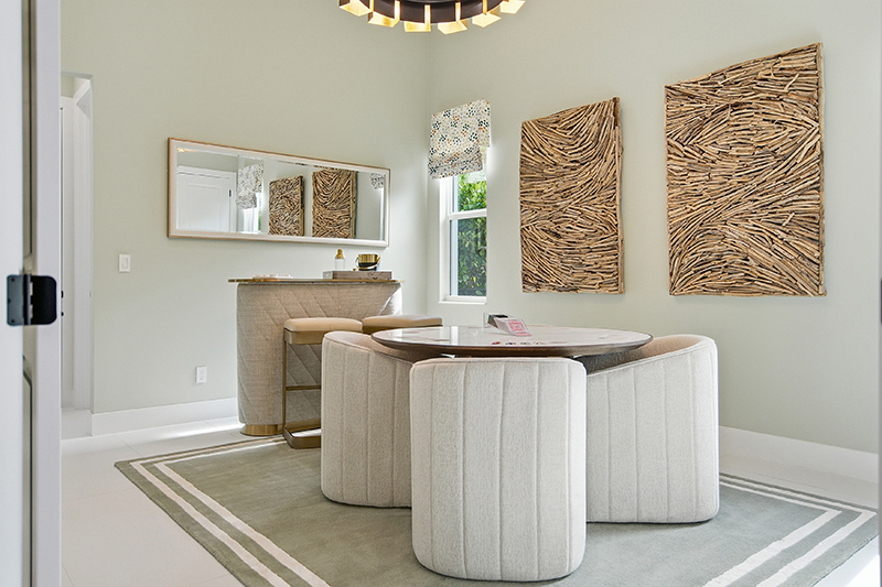 Krynski notes the use of textured wallpaper in the coffered ceiling and how the elegant chandeliers and lighting fixtures add a modern touch. The chic coastal-modern furniture was curated for the home’s dimensions.