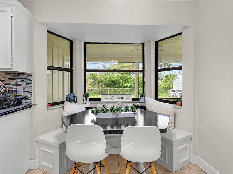 The kitchen flows into a deep bay breakfast nook with a trio of wide windows looking out onto the screened porch, lush yard and woodsy vegetation beyond. A pedestal table with black top, two white chairs, and built-in, three-sided bench grace this charming and highly functional space.