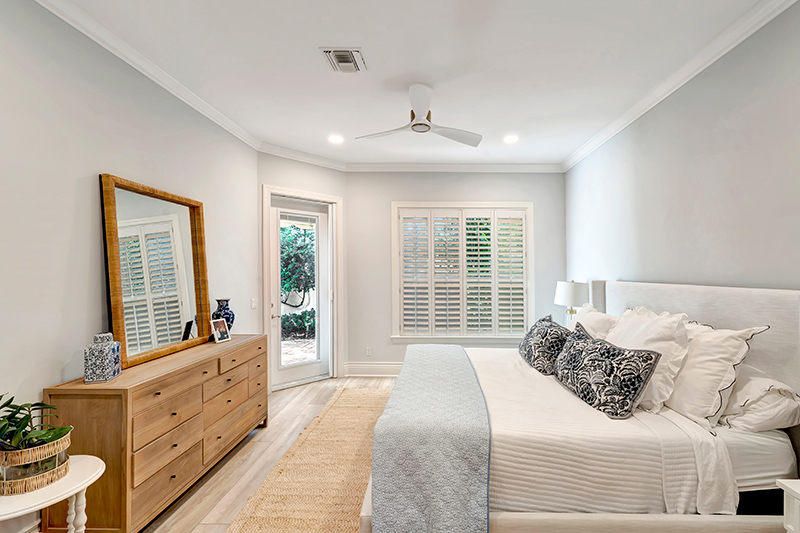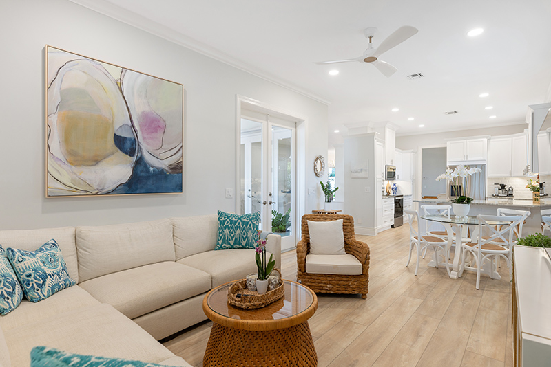 The veranda leads in turn to the front door, beyond which is a small foyer that opens into the living room and dining room. There, the sensation is one of light and air, enhanced by a subtle, contemporary aesthetic. The extensive 2024 renovation, which included an updated kitchen and bathrooms with new flooring, new A/C, lighting and ceiling fans, created a high-end beach cottage that embraces the coastal lifestyle.